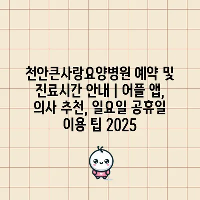 천안큰사랑요양병원 예약 및 진료시간 공지 | 어플 앱, 의사 추천, 일요일 공휴일 이용 팁 2025 천안큰사랑요양병원에서는 편리한 예약 시스템을 알려드려 …