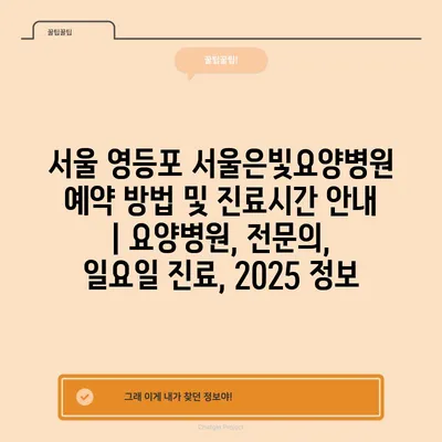 서울 영등포 서울은빛요양병원 예약 방법 및 진료시간 공지에 대해 설명알려드리겠습니다. 서울은빛요양병원은 전문적인 의료진이 상담과 진료를 제공하는 시설입니다. 예약은 전화나 온라인 …